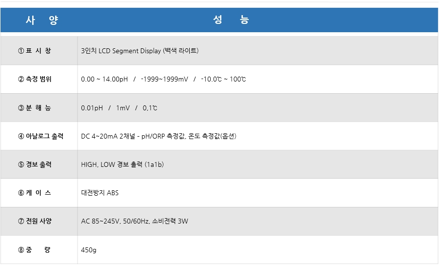측정범위 | 0.00~14.00pH / -1999~1999mV -10.0 ~ 100°c(옵션) |