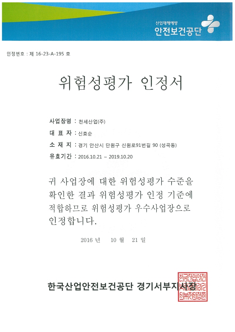 천세산업(주) 반월공장 임직원이 합심해 산업재해 예방에 앞장서,   공장 내 유해·위험요인을 발굴하고 개선하여 안전한 일터 조성에 전사적 노력을 경주한 바,   위험성평가 우수사업장으로 인정되었습니다.   앞으로도 자발적인 공장 내 안전 관리를 통해 재해 없는 사업장을 만들고,   안전한 일터 조성을 위해 매년 지속적인 위험관리 개선활동을 펼치도록 하겠습니다.   감사합니다.     위험성평가란? 안전하고 건강한 사업장 조성을 위해  사업장 스스로 유해·위험요인을 파악하고  이에 대한 개선대책을 수립하는 제도로  해당 제도를 우수하게 수립 실시한 사업장에 대해  한국산업안전보건공단에서 인정하는 제도이다.