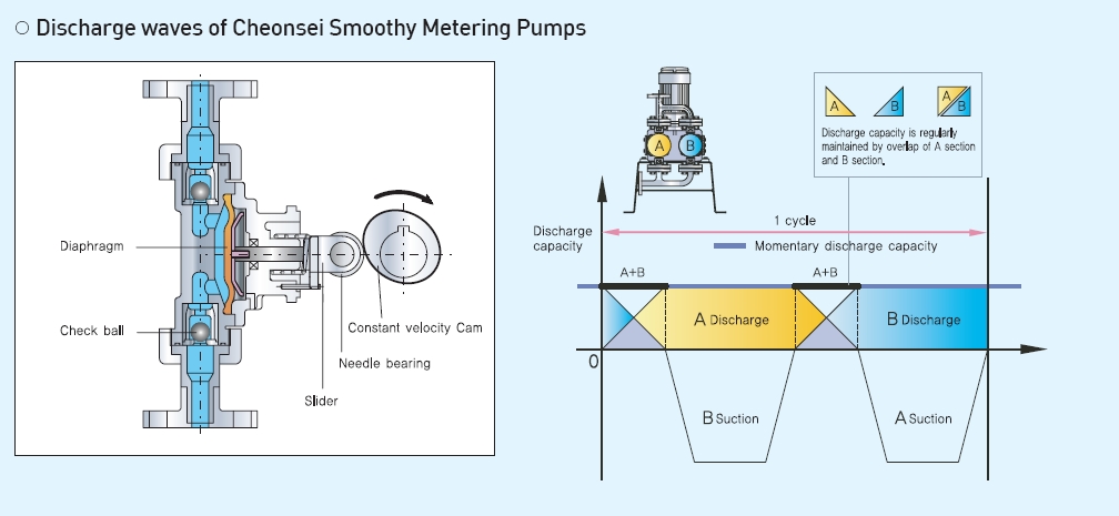 In general, Metering pumps have advantages for high discharge pressure, fixed quantity, and corrosion resistance, but it could be restricted for use according to the process because it have characteristic arising pulsation in injection side caused by operating principle. Cheonsei has developed constant velocity cam which removes its characteristic radically, and has completed Smoothy Metering Pumps as patent technology for correction of constant velocity cam. It has acquired Certificate of New Excellent Product(Nep) and Excellent Performance Certification(EPC) by patent technology.