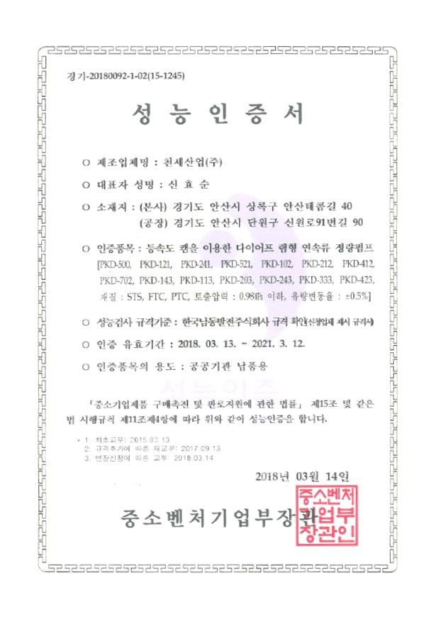 안녕하세요. 천세산업(주)입니다.   2018년 3월 13일자로   당사의 스무디 정량펌프 PKD 제품이   제품 성능의 우수함을 인정받아,   성능인증서 획득에 성공하였습니다.   천세산업(주)는 지속적인 기술 개발과 혁신으로   선도적 기업으로서 고객여러분들을 맞이하겠습니다.   앞으로도 많은 관심 부탁드립니다.   감사합니다.