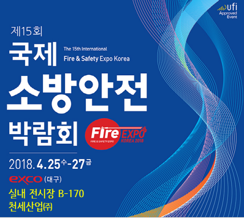 안녕하십니까 천세산업(주)입니다. 당사는 4월 25일(수)부터 4월 27일(금)까지 대구 EXCO 실내외 전시장에서 개최되는 제 15회 국제소방안전박람회에 참가합니다. 아래와 같이 안내해 드리오니, 많은 관심과 성원 부탁드립니다. 감사합니다. === 아래 === - 전시회명 : 제 15회 국제소방안전박람회 - 전시품목 : 소방장비, 소방제품, 소방안전 관련 제품 외 - 개최 기간 : 2018년 4월 25일(수) ~ 27일(금) 3일간 - 개최 장소 : 대구 EXCO 실내외 전시장 - 부스번호 : B-170