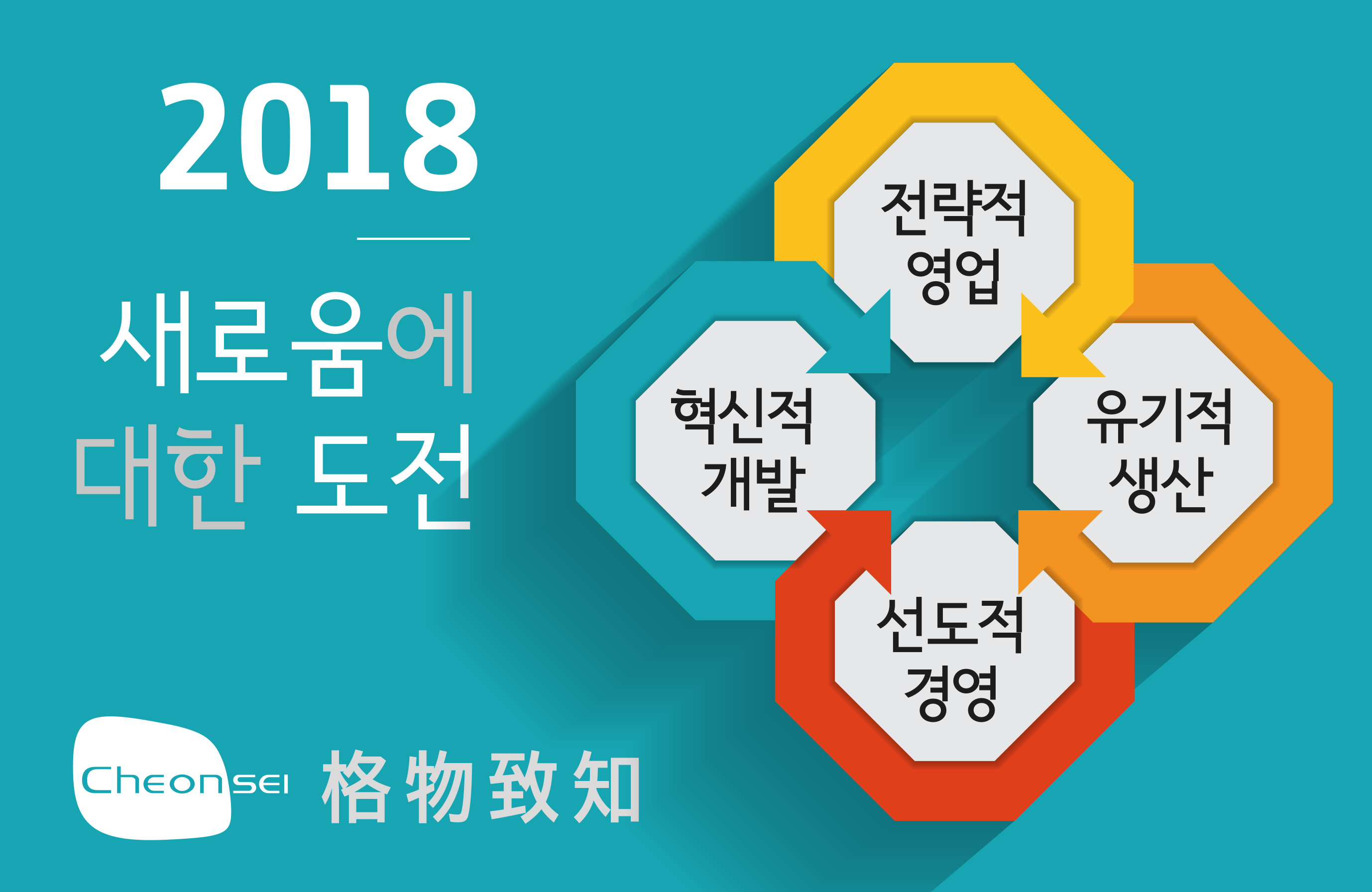 안녕하세요. 천세산업(주)입니다.   2018년 1월 2일(월) 본사 3층 강당에서    2018년의 시작을 알리는 천세산업(주) 2018년 시무식이 진행되었습니다.    신효순 대표이사의 신년사와 권호남 이사의 매출 및 경영보고,   부서발령에 따른 발령장 및 진급 수여식, 신입사원 소개, 캐치프레이즈 제창, 사진 촬영이 이어졌고,   전직원이 함께 떡국을 나눠먹는 시간을 끝으로 시무식은 종료되었습니다.   천세산업(주)는 2018년을 "새로움에 대한 도전"의 해로 정하였습니다.    "타성과 선입견을 버리고 새롭게 보아야만, 새로운 도전을 할 수 있다"라는 의미에서 입니다.   올 한해, 천세산업(주)의 모든 고객분들의 안녕과 건강을 기원합니다.   감사합니다.