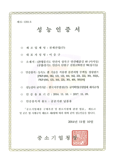 2014년 11월 10일 자로 당사의 등속도 캠 기술을 적용한 플런저형 무맥동 정량펌프가 중소기업제품 구매촉진 및 판로지원에 관한 법률 제 15조 및 같은 법 시행규칙 제 11조 제4항에 따라 성능인증을 획득 하였습니다. 기간 : 2014년 11월10일 ~ 2017년 11월9일 (3년간)
