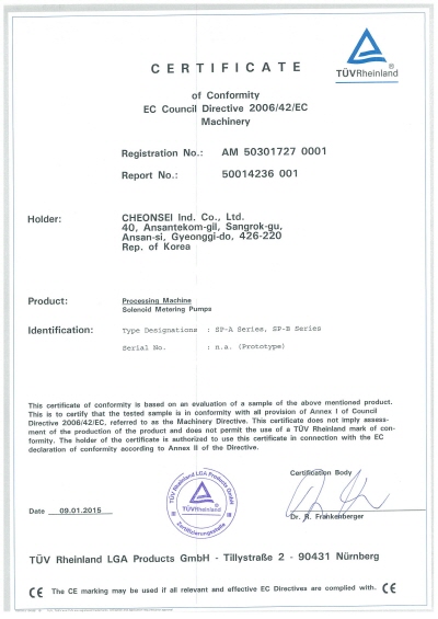 2015년 1월 9일 자로 당사의 솔레노이드정량펌프가 CE인증서를 획득하였습니다.