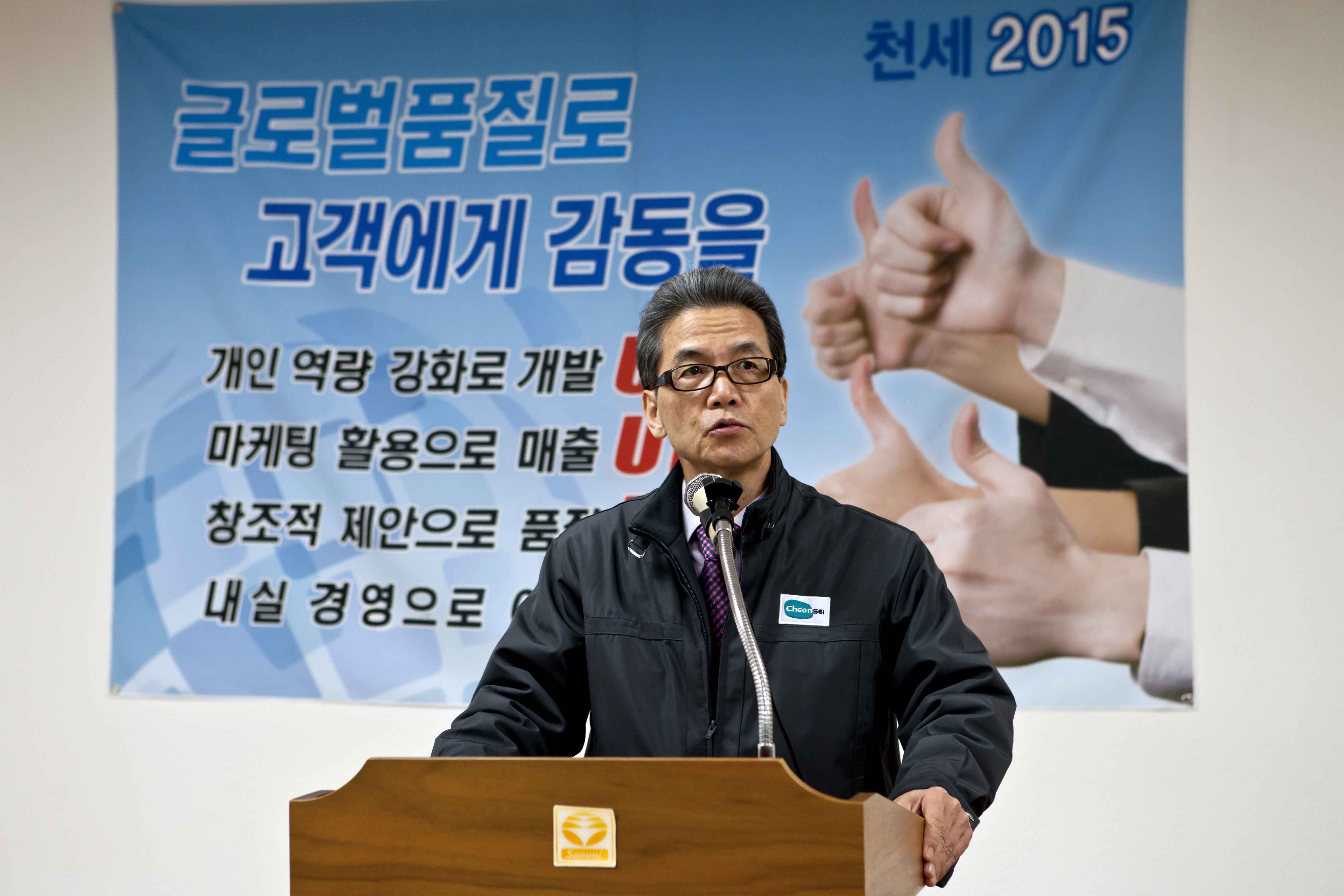 2015년 1월 5일(월) 본사 3층 강당에서 시무식이 있었습니다. 이날 행사에서는 이충구 대표이사의 신년사와 신효순 사장의 경영보고, 권호남 공장장의 취임사가 있었으며, 부서발령에 따른 발령장 수여식과 천세제품지식Q&A 성적우수자포상이 함께 진행되었습니다.