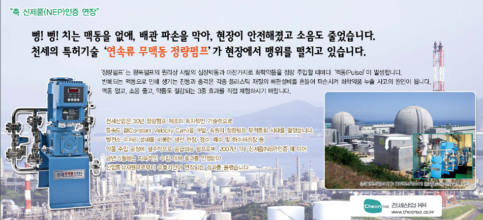 당사의 다이어프램형 무맥동 정량펌프(PKD)가 신제품(NEP)인증 연장에 성공했습니다. 아래는 2013년 5월 27일자 산업데일리 신문 3면 하단에 기재된 광고내용 입니다. “축 신제품(NEP) 인증 연장” 뻥! 뻥! 치는 맥동을 없애, 배관 파손을 막아, 현장이 안전해졌고 소음도 줄었습니다. 천세의 특허기술 ‘연속류 무맥동 정량펌프’가 현장에서 맹위를 떨치고 있습니다. ‘정량펌프’는 왕복펌프의 원리상 사람의 심장박동과 마찬가지로 화학약품을 정량 주입할 때마다 ‘맥동(Pulse)’이 발생합니다. 반복되는 맥동으로 인해 생기는 진동과 충격은 각종 플라스틱 재질의 배관설비를 흔들어 파손시켜 화학약품 누출 사고의 원인이 됩니다. 맥동 없고, 소음 줄고, 약품도 절감되는 3중 효과를 직접 체험하시기 바랍니다. 천세산업은 30년 정량펌프 제조의 독자적인 기술력으로 등속도 캠(Constant Velocity Cam)을 개발, 숙원의 정량펌프 무맥동화 시대를 열었습니다. 발전소 수처리 설비를 비롯한 생산 현장, 정수, 폐수 및 하수처리장 등 약품 주입 공정에 필수적으로 공급되는 펌프로써, 2007년 1차 '신제품(NEP)인증’에 이어 금년 5월에는 지속적인 수입 대체 효과를 인정받아 산업통상자원부로부터 유효기간이 연장되는 성과를 올렸습니다.