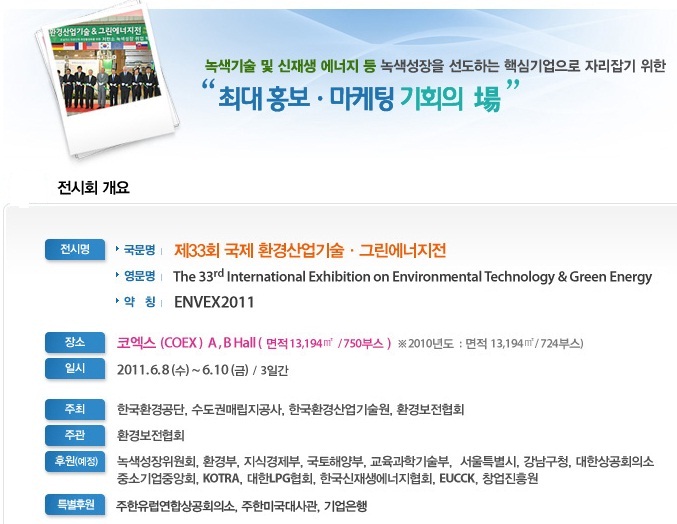 당사는 2011년 6월 8일(수) 부터 6월 10일(토)까지 개최되는 제33회 국제환경산업기술 & 그린 에너지 전시회에 참가합니다. 전시 부스는 A1홀 A 07 입니다. 여러분들의 많은 관심과 참여 바랍니다.