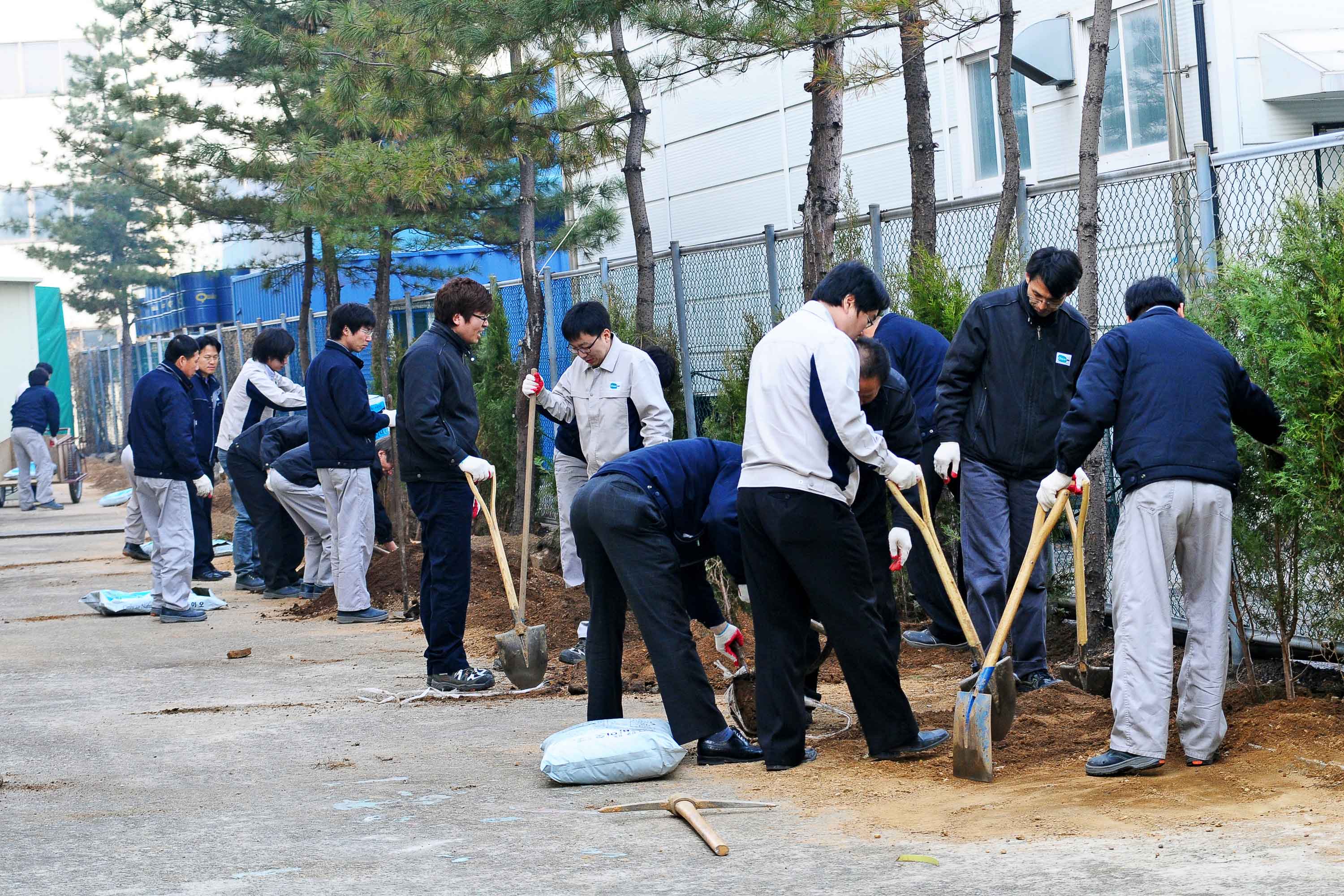 지난 3월 30일 당사 반월공장에서 식목행사가 있었습니다. 이날 측백나무100그루를 심고, 식목일 다음날인 4월 6일에는 추가로 감나무와 모과나무도 심었습니다. 아래사진은 3월 30일 측백나무를 심는 모습입니다.