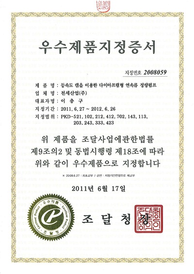 2011년 6월 17일 당사 '등속도 캠을 이용한 다이아프램형 연속류 정량펌프'와 '플런저형 무맥동 정량펌프'의 조달청 우수제품지정 기간이 각 1년씩 연장 되었습니다. 이로써 지정기간은 지난 2008년 6월 27일 부터 2012년 6월 26일 까지가 되었습니다.
