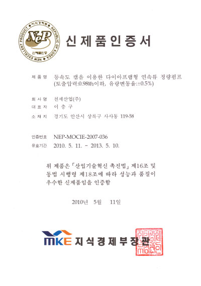 2010년 6월 10일 당사의 유압식 정량펌프에 대한 기술이 특허 등록되었음을 알려드립니다. 본 특허의 핵심기술은 유압식 정량펌프에 있어 오일 부족시 자동으로 공급하는 리필밸브에 관한 기술입니다.