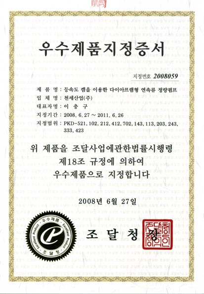 2008년 6월27일 무맥동정량펌프가 조달청 우수제품으로 지정되었음을 알려드립니다