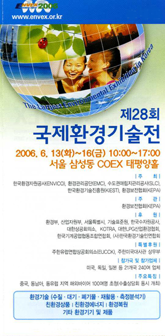 당사는 2005년 6월 13 ~ 16일 4일 동안 제28회 국제 환경기술전(ENVEX 2006' KOEX)에 참가하여 성황리에 전시회를 마쳤습니다. 전시기간동안 천세 제품에 많은 관심과 성원을 보여주신 여러분들께 진심으로 감사드리며, 앞으로도 많은 격려 부탁드리겠습니다 -전시회 관련사진-