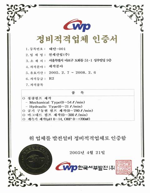 천세산업(주)은 한국서부발전(주)로 부터 정비적격업체로 인증을 받았습니다.