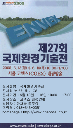 당사는 2005년 6월 13 ~ 16일 4일 동안 제27회 국제 환경기술전(ENVEX 2005' KOEX)에 참가하여 성황리에 전시회를 마쳤습니다. 전시기간동안 천세 제품에 많은 관심과 성원을 보여주신 여러분들께 진심으로 감사드리며, 앞으로도 많은 격려 부탁드리겠습니다 -전시회 관련사진-