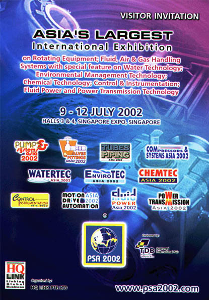 본사가 이번 PUMPS & SYSTEMS ASIA 2002 에 참가 하게 되었습니다. 많은 관심 부탁들입니다. 장소 : HALLS 3 & 4, SINGAPORE EXPO, SINGAPORE 기간 : 2002년 7월 9일~12일 부스번호 : 3 홀 3772 관람일정 7월 9일 10:00am~11:00am (관계자 입장) 12:00am~06:00pm (일반 입장) 7월 10일~11일 10:00am~06:00Pm 7월 12일 10:00am~06:00pm 참가 업체 : 다운받기 약도