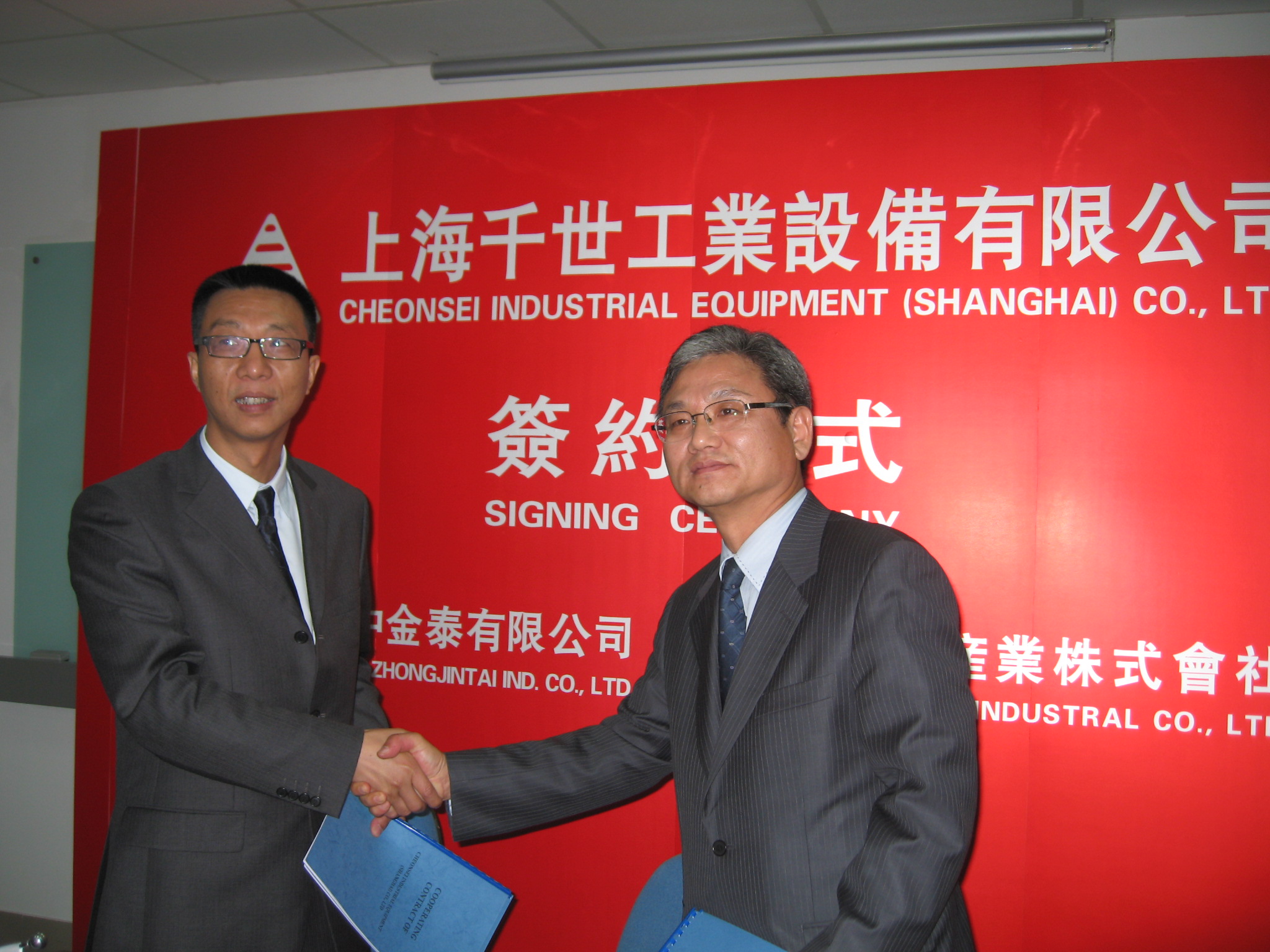 - 우리 천세산업(주)는 중국의 'ZhongJinTai Industrial Co., Ltd. '와 합작회사인 'CHEONSEI INDUSTRIAL EQUIPMENT (SHANGHAI) CO., LTD.'를 설립하기로 하고 11/12일 중국 상해에서 당사 이충구대표이사 및 백영기부사장, 중국측 쉬빈팡대표가 참석한 가운데 합작계약서에 서명을 하였습니다.