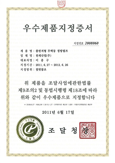 2011년 6월 17일 당사 '등속도 캠을 이용한 다이아프램형 연속류 정량펌프'와 '플런저형 무맥동 정량펌프'의 조달청 우수제품지정 기간이 각 1년씩 연장 되었습니다. 이로써 지정기간은 지난 2008년 6월 27일 부터 2012년 6월 26일 까지가 되었습니다.