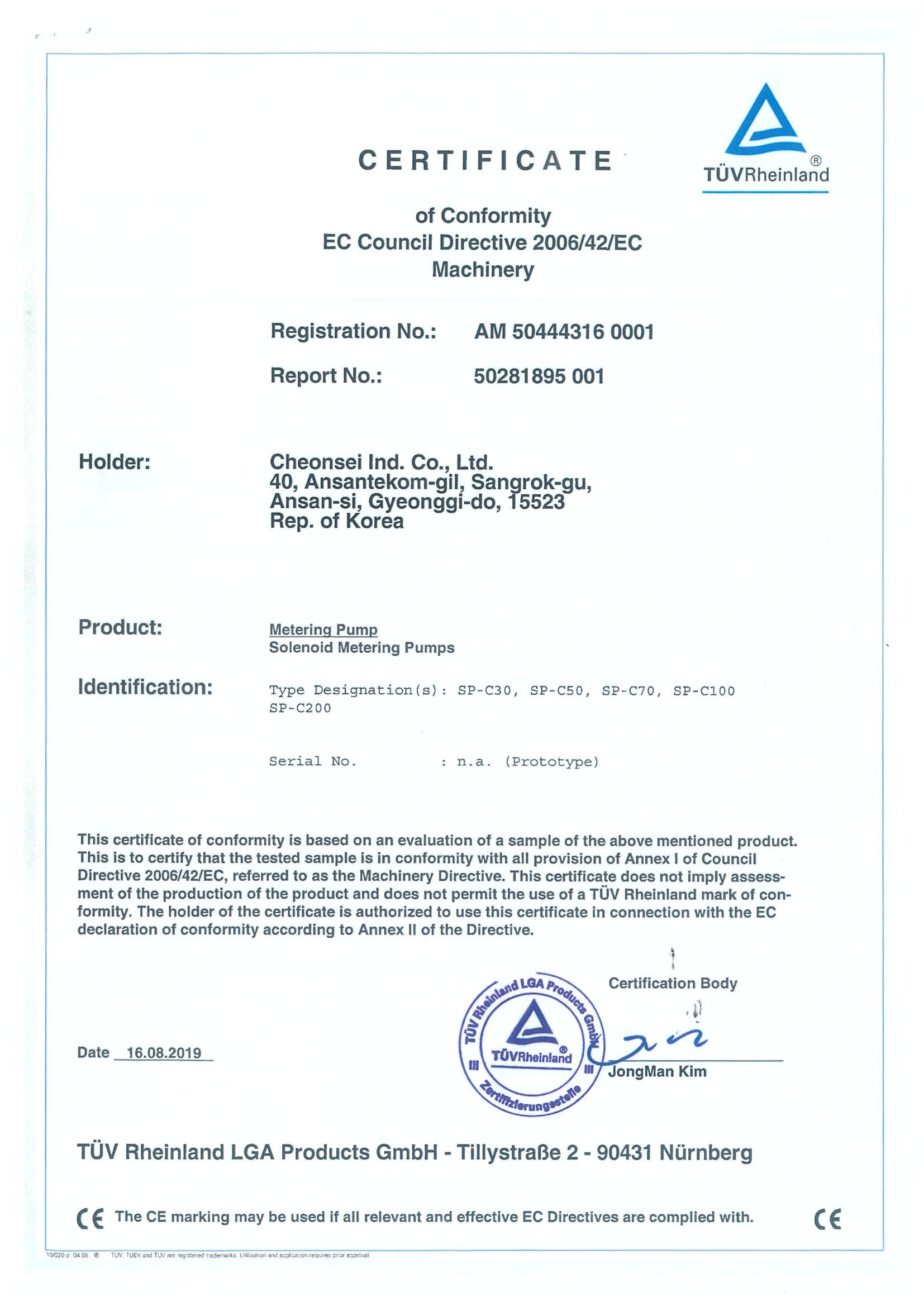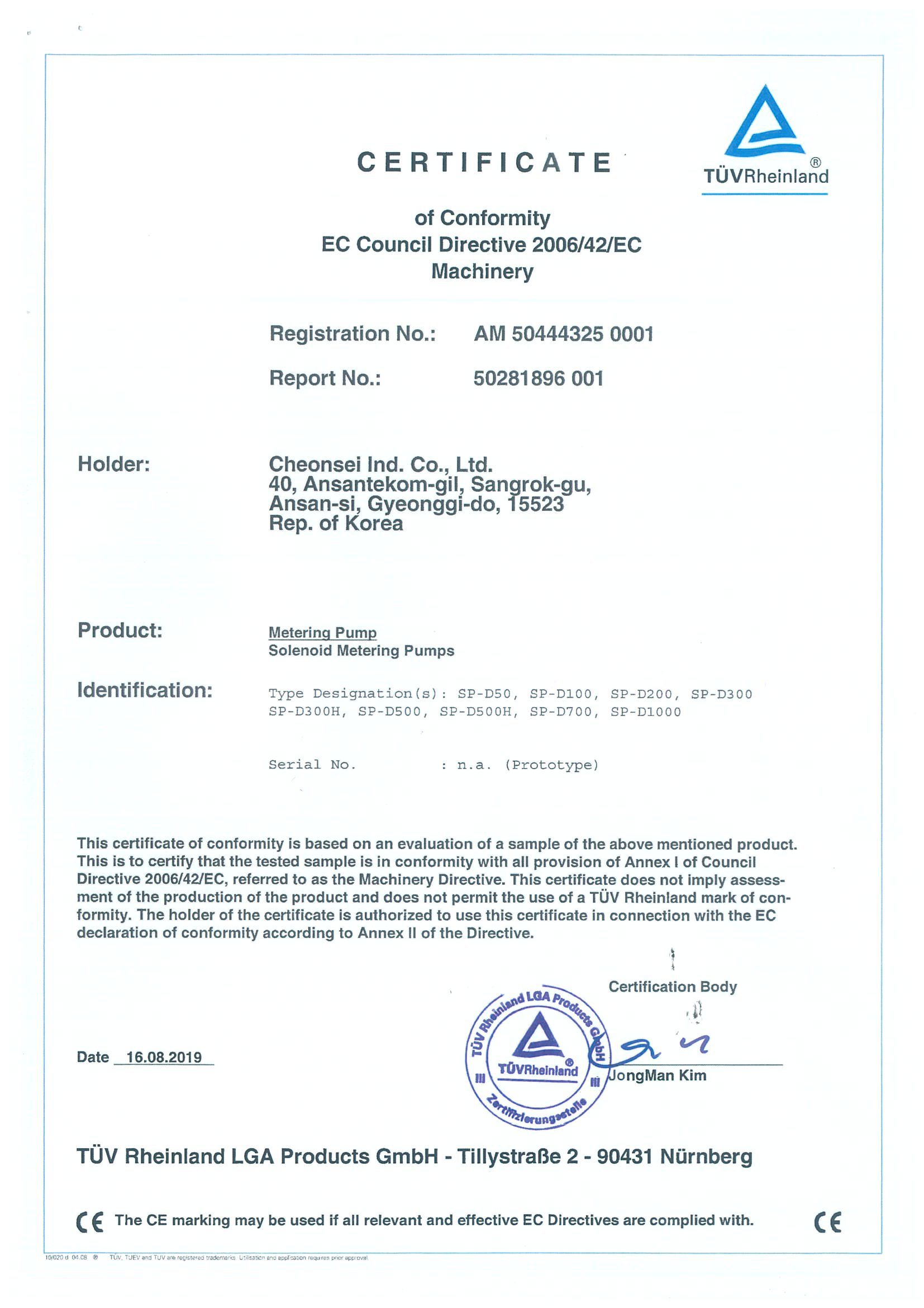 당사는 2019년 8월 16일자로 SP-C, SP-D 모델에 대하여 CE 인증을 획득하였습니다.